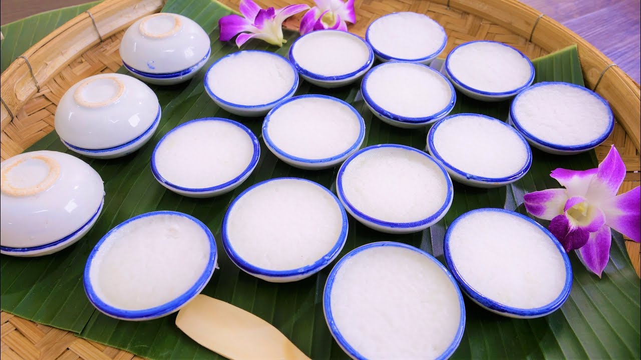 | เปิดฝาออกหยอดมะพร้าวอ่อนลงในขนม จากนั้นหยอดหน้ากะทิให้เต็มถ้วย |